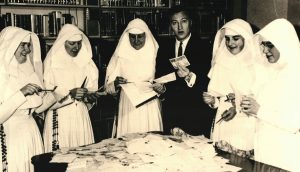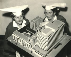 Mercy nurses inspect the architectural model for the new Mercy Maternity Hospital, circa 1970.