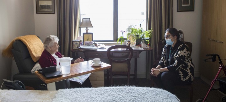 Mercy Place East Melbourne Acting Service Manager Gurpreet Kaur spends some time with resident Patricia Mills.